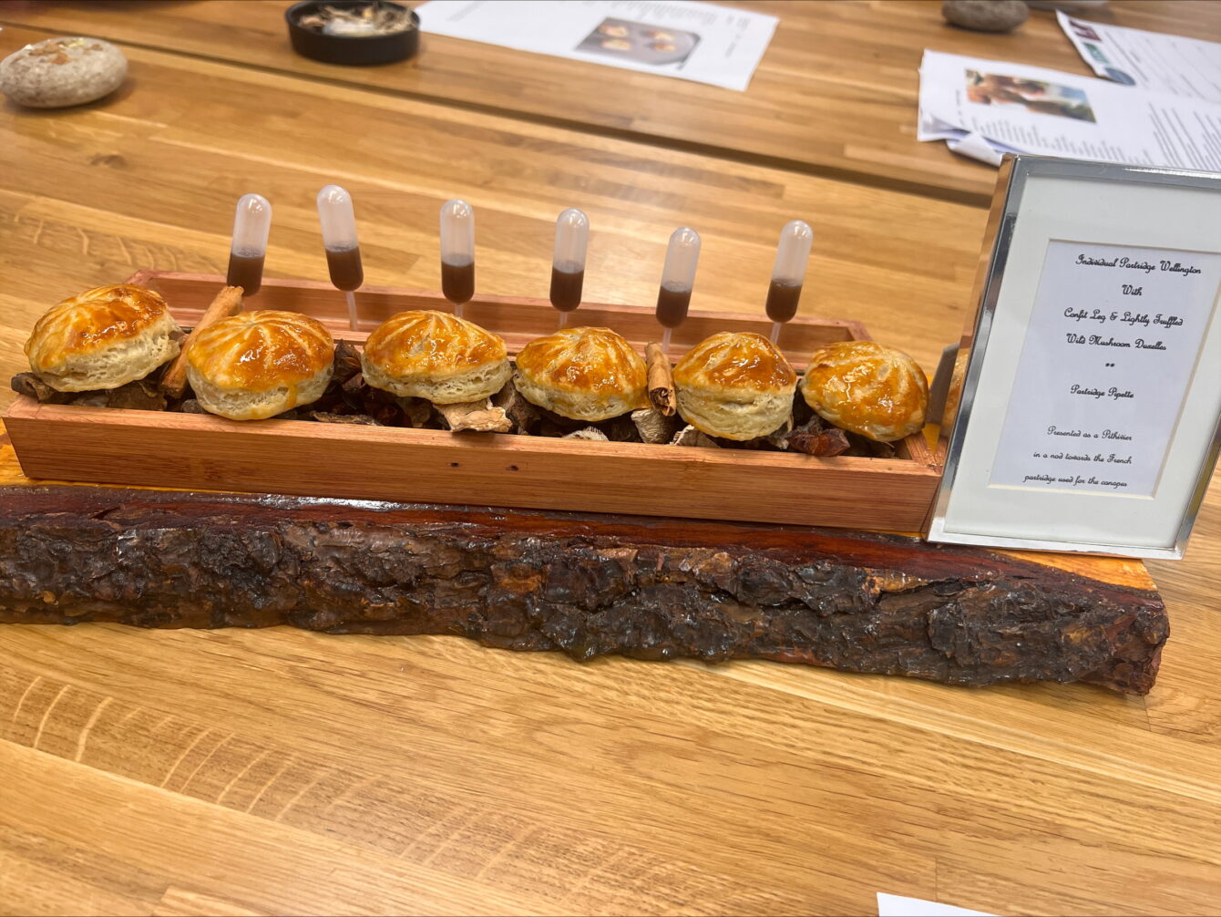 A nod to the French Pithivier, which is an enclosed pie usually made by baking two discs of puff pastry, with a filling stuffed in between, Josh’s mini wellingtons incorporated a mushroom duxelle (a finely chopped mixture of mushrooms, herbs, garlic, and shallots cooked in butter), truffle oil and pipettes of partridge sauce to be squeezed onto them.