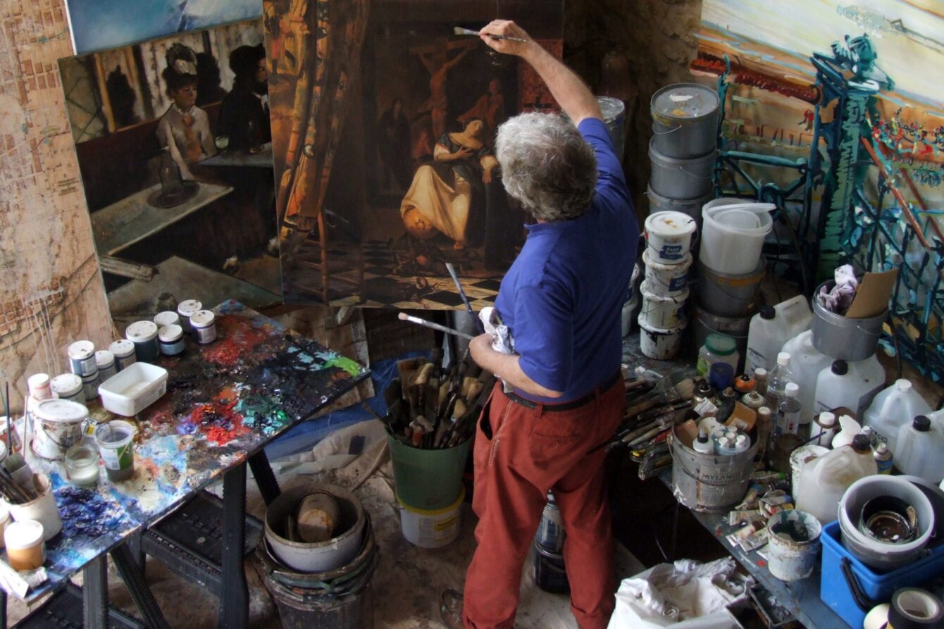 Oxfordshire-based artist James Gemmill has a wide-ranging artistic career, working in film, television, and design, as well as in the more traditional context of gallery artist. His paintings are held in distinctly prestigious collections in different countries. Gemmill’s life as a working artist is now a culmination of the knowledge gained through studio painting, film art, design and being around engineers, clients, and patrons. He has been commissioned large works in the cinematic world. James never knows what he will be creating from one day to the next. The size, medium, and location are always in flux. The possibilities are endless and exciting.