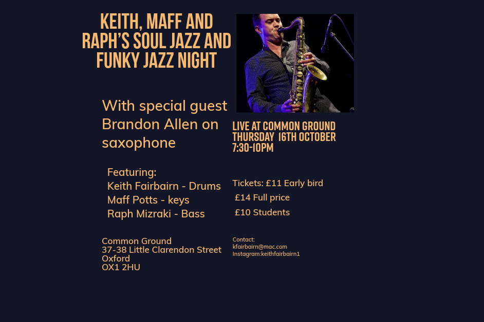 Featuring virtuosic tenor saxophonist Brandon Allen, with the groove team of keyboardist Maff Potts, electric bass virtuoso Raph Mizraki, and the ever-groovy Keith Fairbairn on Drums.