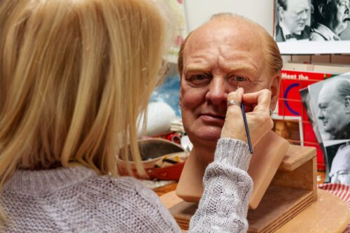 Colour and hair artist Sue Day adds the final touches to a waxwork of Sir Winston Churchill, ahead of the…